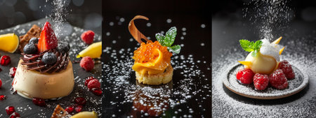 A selection of gourmet desserts, including panna cotta and tarts, beautifully arranged and dusted with powdered sugar on a black background. The elegant and indulgent presentation is ideal for food photography, dessert, and gourmet themes.
