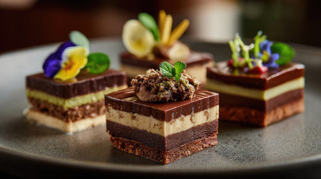 A beautifully crafted dessert showcases layers of chocolate and caramel, garnished with edible flowers and decorative elements, perfect for a fine dining experience.