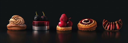 Elegant pastries with colorful toppings rest on a black plate, their intricate designs highlighted against a rich, dark background.