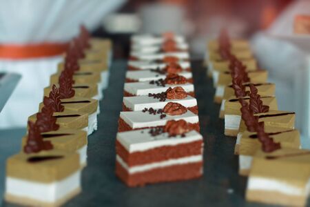 Small chocolate and vanilla layered cakes in rows on candy buffet. Sweet paradise.