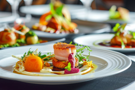 gourmet catering art, exquisite gourmet dishes crafted by renowned chefs for an upscale event catering menu, highlighting culinary mastery and innovation