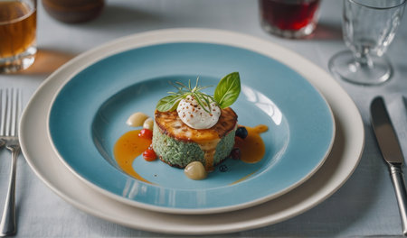 A close-up of an elegantly plated gourmet dish with vibrant colors and artistic presentation, showcasing fine dining details ready to be served.