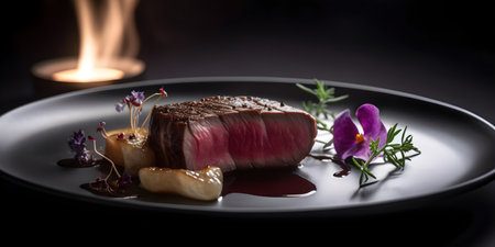 AI Generated. A succulent steak served on a black slate plate emphasizing its juicy texture and flavorful seasoning