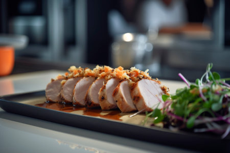 Gourmet Dish Prepared In A High End Restaurant Kitchen Displaying Gourmet Food Being Prepared. Concept Gourmet Cuisine, Fine Dining Experience, High-End Restaurant, Gourmet Food Preparation.