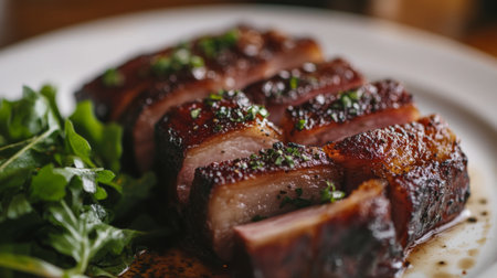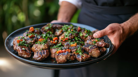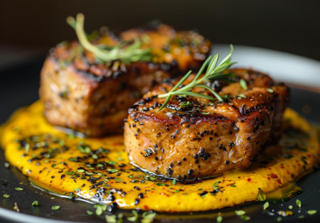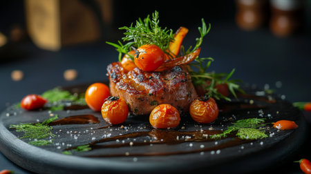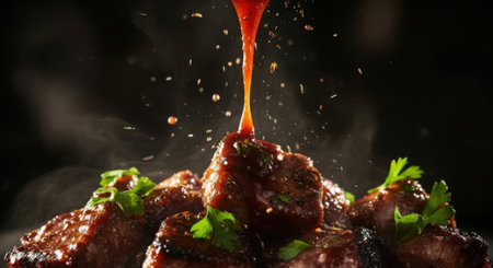 Grilled Meat Served With Rich Sauce and Fresh Herbs on a Textured Plate During a Vibrant Culinary Presentation. Generative AI