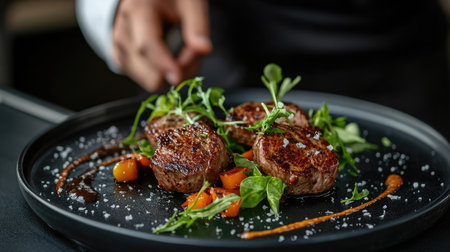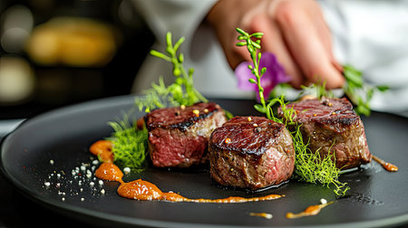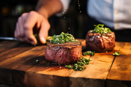 hand garnishing freshly grilled filet mignon with herbs, created with generative ai