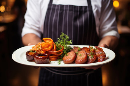 waiter serving dish of smoked sausages at restaurant