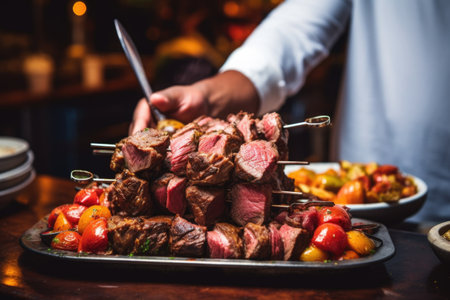 man serving freshly cooked skewered meat from brazilian churrasco