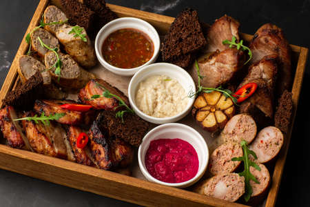 Close-up photo of mixed grilled meat platter. Beef, pork, poultry, sausages, grilled garlic, chili pepper, different sauces on marble background