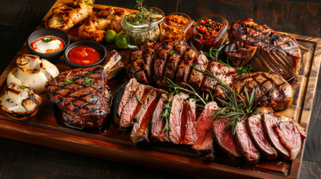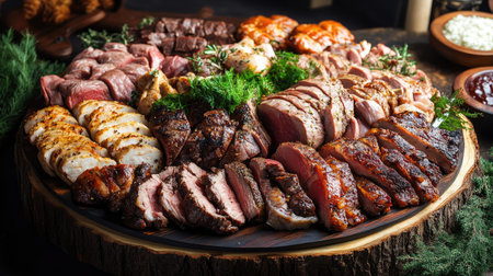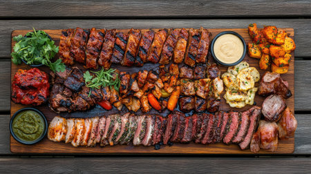A beautifully arranged assortment of grilled meats on a wooden board, featuring rich flavors and vibrant sides, perfect for gatherings and celebrations.