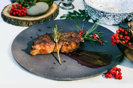 Grilled beef steak cooked on barbecue, closeup on dark wooden table background. Fresh juicy roasted red meat on black stone board, pepper and rosemary. Restaurant food, delicious dish, selective focus