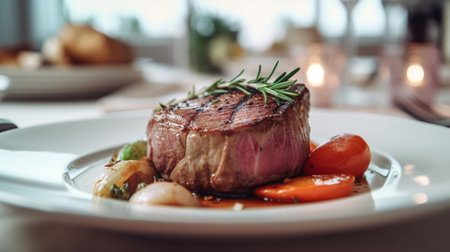 Close up of a plate of grilled stake decorated with vegetable on a table. The plate is a medium-rare steak with dark red color in the middle and brown around the edges with blurring background. AIG42.