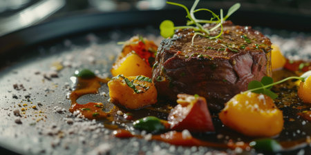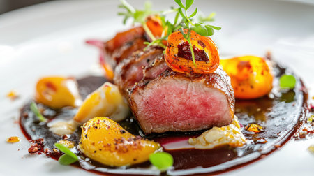 Exquisite close-up of a gourmet steak topped with caramelized peach, served with fresh vegetables and artistic sauce splatter