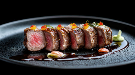 A stunning presentation of Wagyu sushi, featuring tender slices of beef elegantly arranged on a black plate, garnished with vibrant accents and rich sauces.