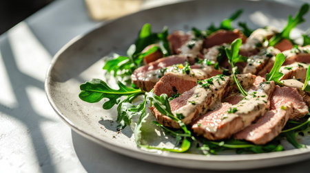 A beautifully arranged gourmet Vitello Tonnato dish featuring slices of meat drizzled with sauce and garnished with fresh arugula, perfect for culinary enthusiasts.