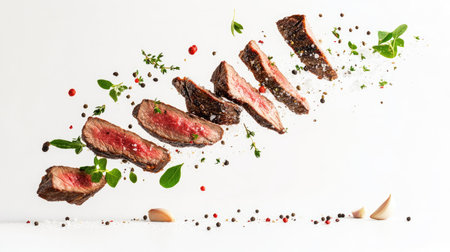 This captivating image features grilled beef slices mid-air, surrounded by a sprinkle of spices and fresh herbs. Perfect for food photography, culinary art, and cooking inspiration.