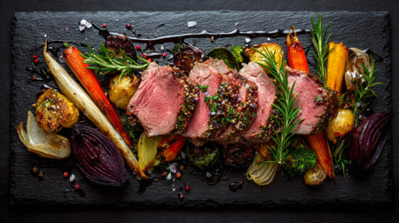 A beautifully plated roast beef dish featuring juicy slices paired with an assortment of colorful vegetables and fresh herbs, perfect for a gourmet meal.