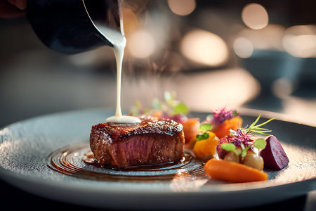 Gourmet steak topped with caramelized onion and fresh herbs on an elegant plate with artistic garnishes. Concepts of fine dining, culinary arts, and food presentation.