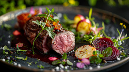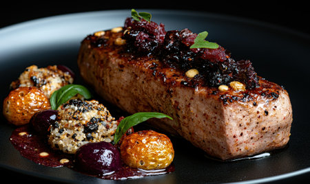 Juicy beef steak with garnish and berry sauce on a textured plate