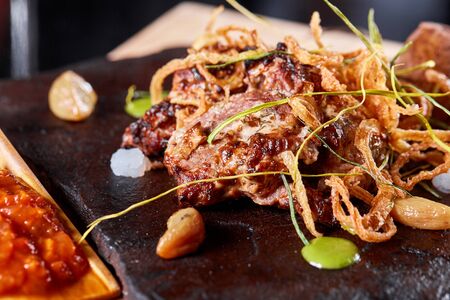 Grilled Beef steak Ribeye with roasted potato on cutting board. With deep-fried onions and tomato sauce.