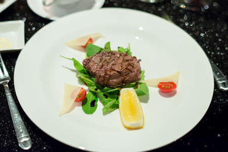 Beef steak with vegetables on a plate in a restaurant. Restaurant