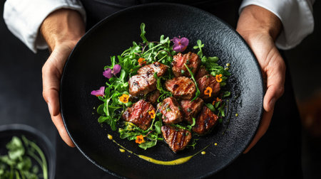 A visually stunning gourmet dish featuring savory meat cubes, vibrant sauces, and fresh microgreens, showcasing culinary artistry on an elegant plate.