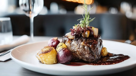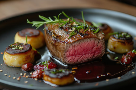 A beautifully arranged grilled steak served with roasted potatoes and a rich sauce. This gourmet dish highlights culinary excellence and fine dining experience.