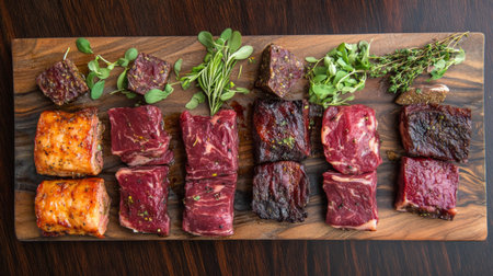 A stunning array of assorted red meat cuts showcased on a wooden platter, accompanied by vibrant fresh herbs and spices, perfect for culinary presentations and gourmet meal ideas.