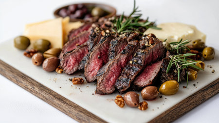 A beautifully arranged charcuterie board featuring slices of steak alongside cheeses, olives, and nuts, all presented on a white surface, inviting guests to indulge in a gourmet experience.