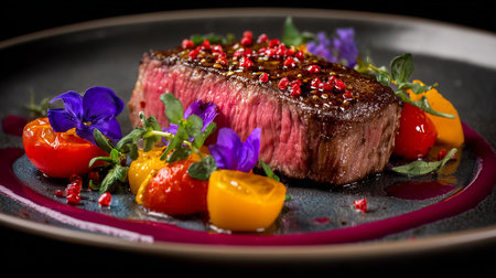 This stunning dish features perfectly cooked beef steak garnished with fresh asparagus and vibrant edible flowers, ideal for fine dining experiences.