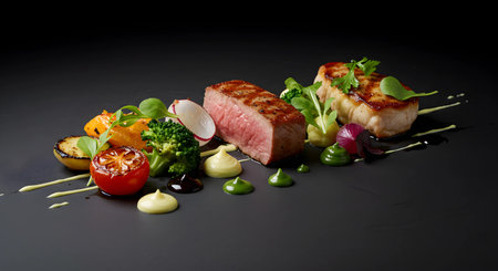 Beautifully plated gourmet steak and fish with vibrant roasted vegetables and artful sauces creates an elegant dining experience perfect for culinary and food-related projects.