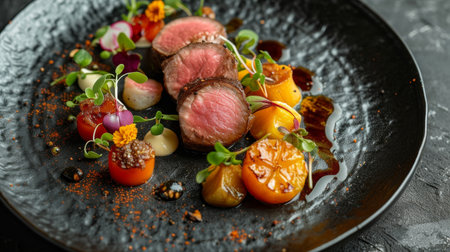 Medium-rare beef tenderloin slices amongst colorful vegetables on a dark plate, accented with edible flowers and delicate sauce