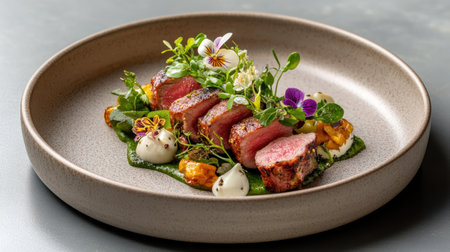 A gourmet dish featuring sliced meat, edible flowers, and vibrant greens