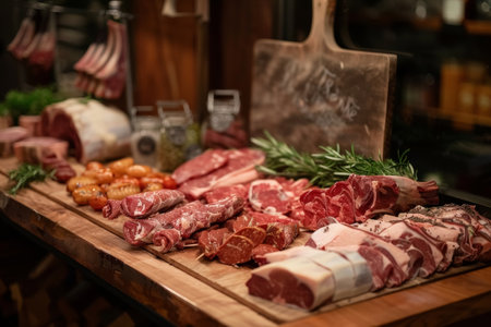 Wide selection of fresh meats on display in a rustic butchery. Culinary craft photography.