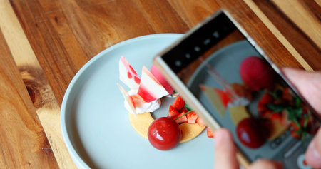 Gourmet dessert on wooden table photographed with smartphone,