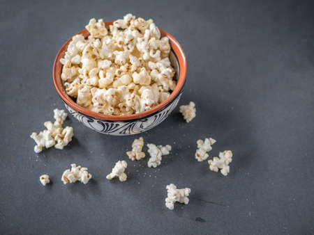 A bowl of delicious popcorn on a light background, natural delicious food for watching a movie