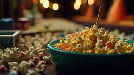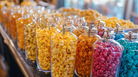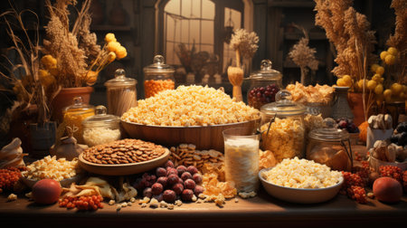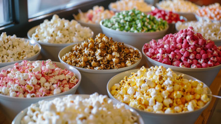 AI Generated. Delicious popcorn varieties sampling event movie theater food display indoor environment aerial view culinary experience