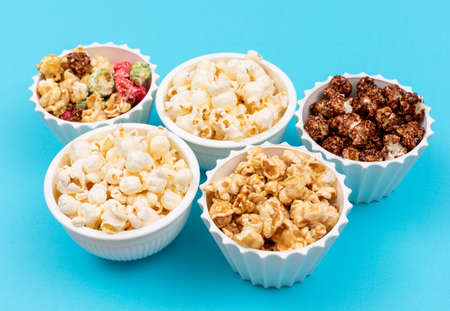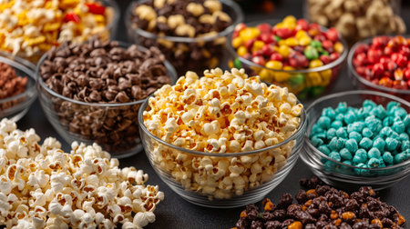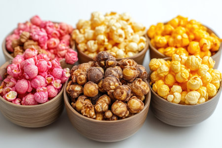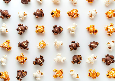 Popcorn assortment grid, including caramel, chocolate, and butter flavors on a light background A colorful and tasty arrangement suitable for food photography