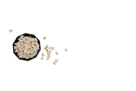 fresh popcorn in bowl top view isolated on white background, space for text healthy snack