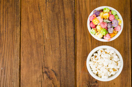 Sweet popcorn and wood background