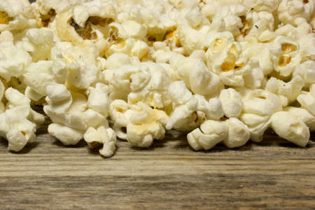 Popcorn flakes on a wooden background.