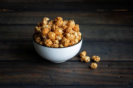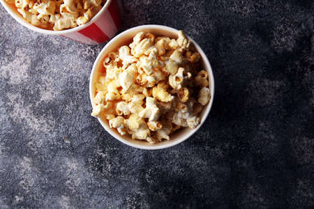 Caramel sweet popcorn, dark background, top view