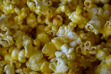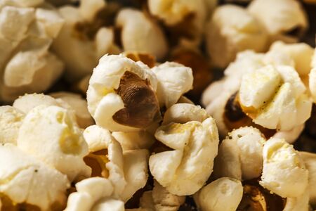 Pile of popcorn close-up macro shot, selective focus, toned