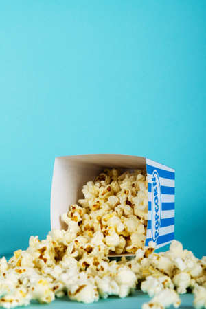 Popcorn on blue background. Copy space