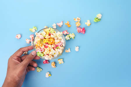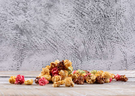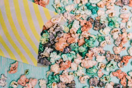 Food background with colorful caramel candy popcorn on a light blue slate, stone or concrete backdrop. Top view with copy space.