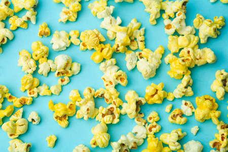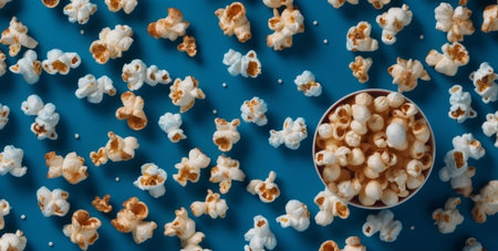 Top view of popcorn on blue background horizontal