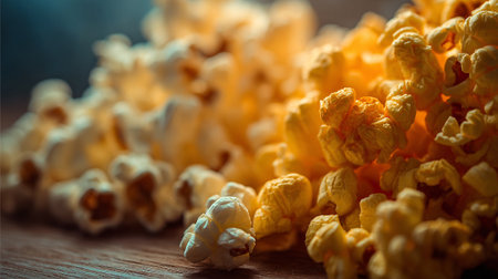 A close-up shot of a pile of popcorn kernels, showing their white and fluffy texture. The image captures the detail of the popcorn's surface and the kernels' golden color, highlighting the appeal of this popular snack.