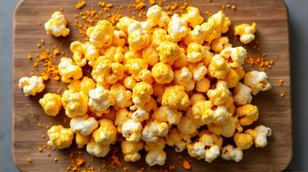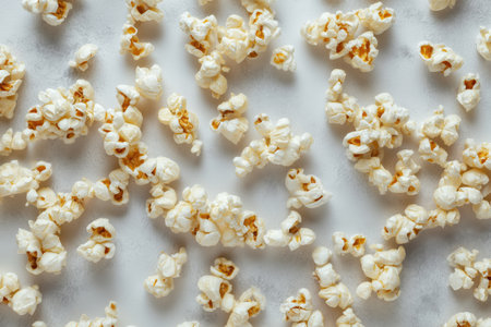 Delicious freshly popped popcorn scattered across a vibrant green surface with soft shadows