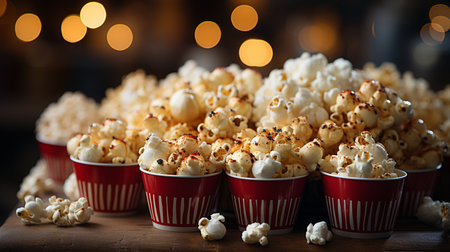 Delicious popcorn overflows from red and white striped containers creating festive mood.