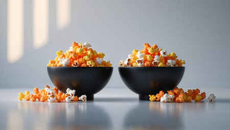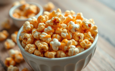 A close-up of gourmet popcorn overflowing from a white ceramic bowl, set against a warm, softly lit background. the popcorn's golden hue and fluffy texture create a cozy and inviting atmosphere, ideal for culinary and snack-themed designs. Generative AI